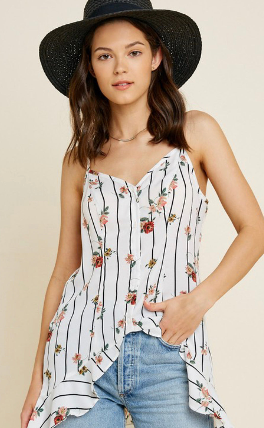Lightweight Floral Button-Down Ruffle Hem Tank. V-Cut Neckline, Functional Front Button-Down Closure, Adjustable Skinny Straps, Ruffle Hemline, High/Low Silhouette