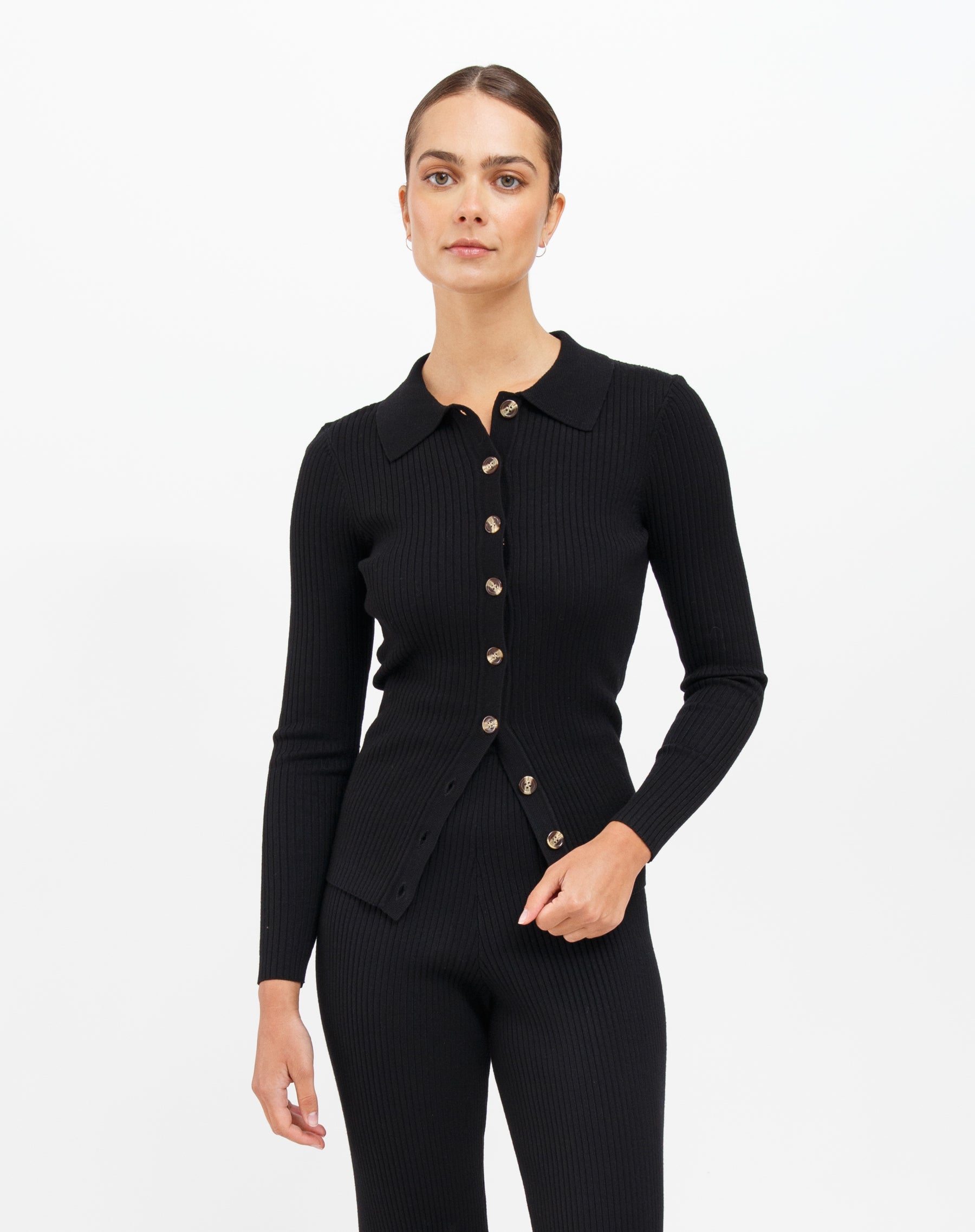 She's in our iconic ribbed knit fabric and features vintage-inspired tortoise buttons and a classic collar. She fits true to size and is waiting to be your new go-to.