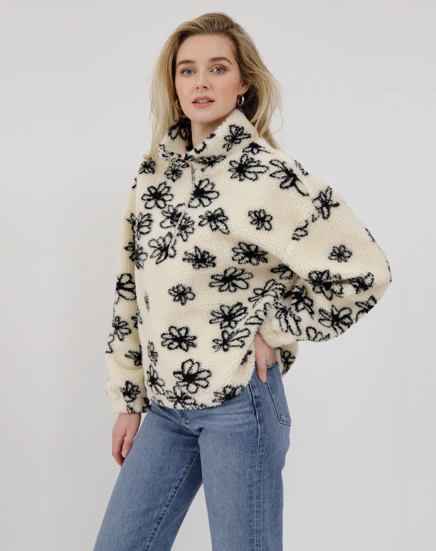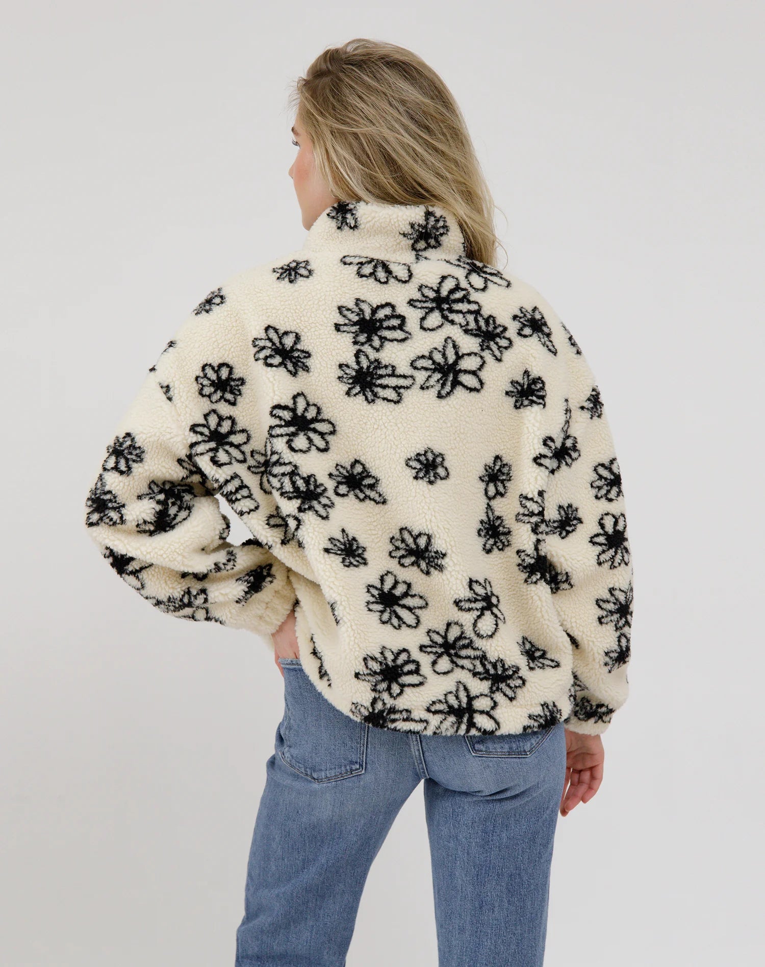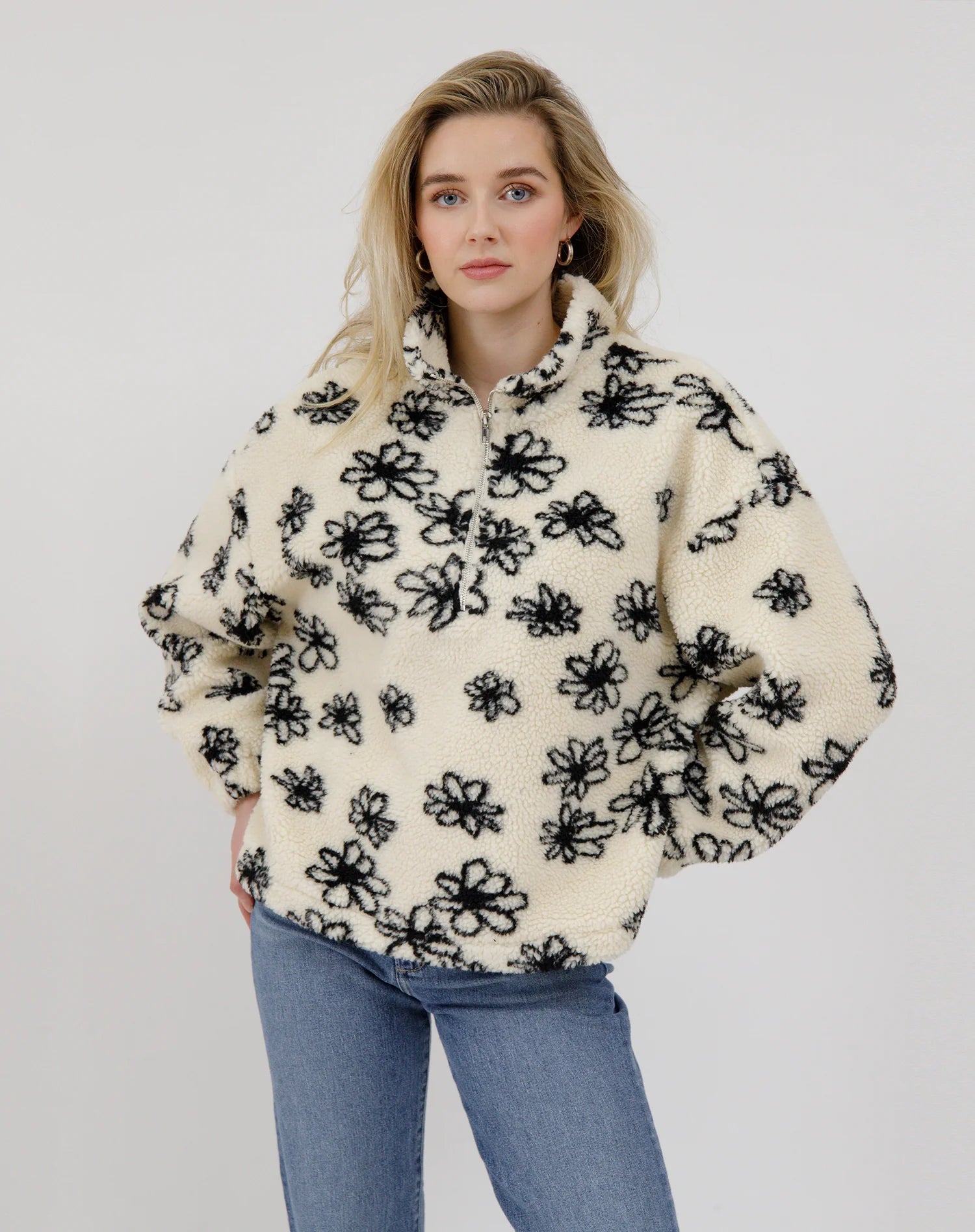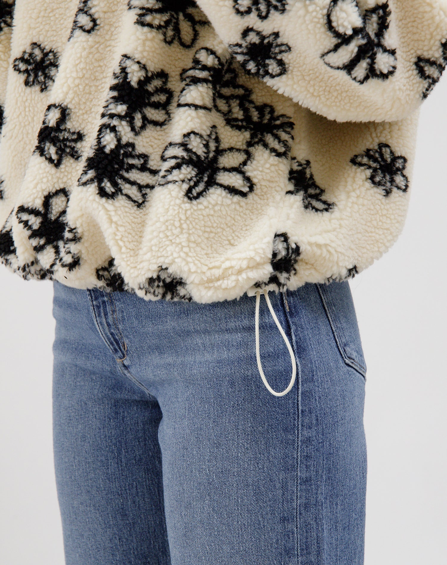 Check out our new Floral Half Zip Sherpa. It's got the classic boxy fit throughout the body with a dropped shoulder. While it's oversized in width, it's not quite as long as our usual Sherpa Jacket. It features adjustable elastics at the hem to fit it to your waist.