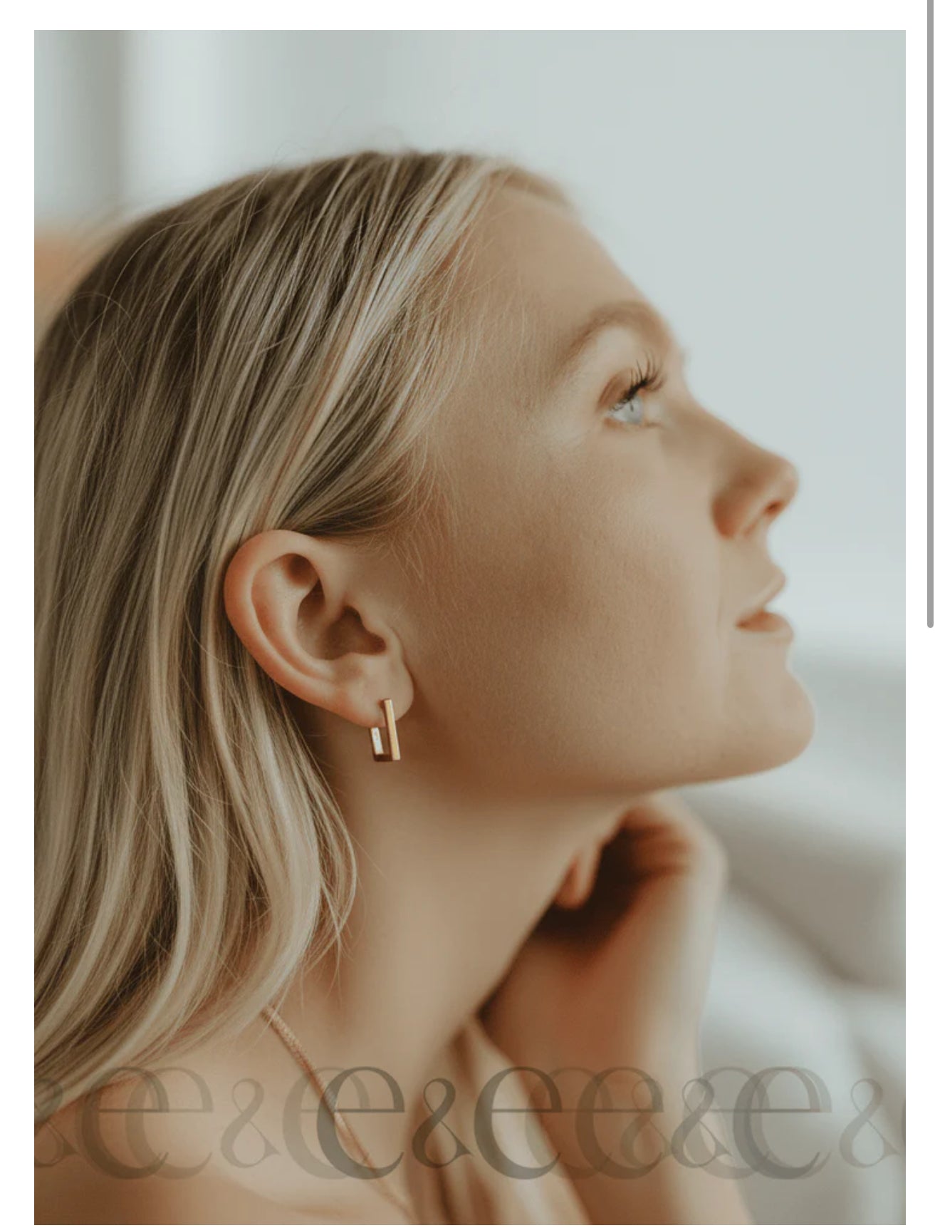 A classic modern rectangular silhouette presenting crisp lines and a slim profile. Lightweight, stackable, and finished in 18K AuraGold PVD on stainless steel with an easy click clasp. Super comfortable for all-day wear.
