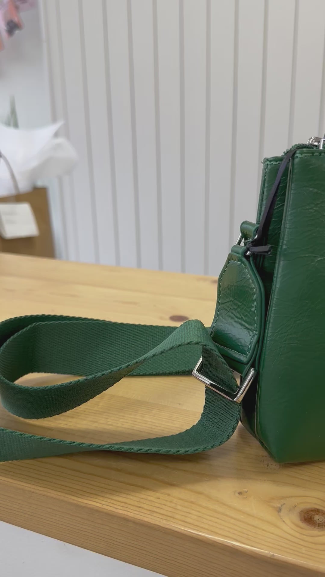 A double-compartment bag with zippered closures, a patch pocket at exterior back which can hold a large smartphone, 6 credit card slots at interior, and an adjustable strap.