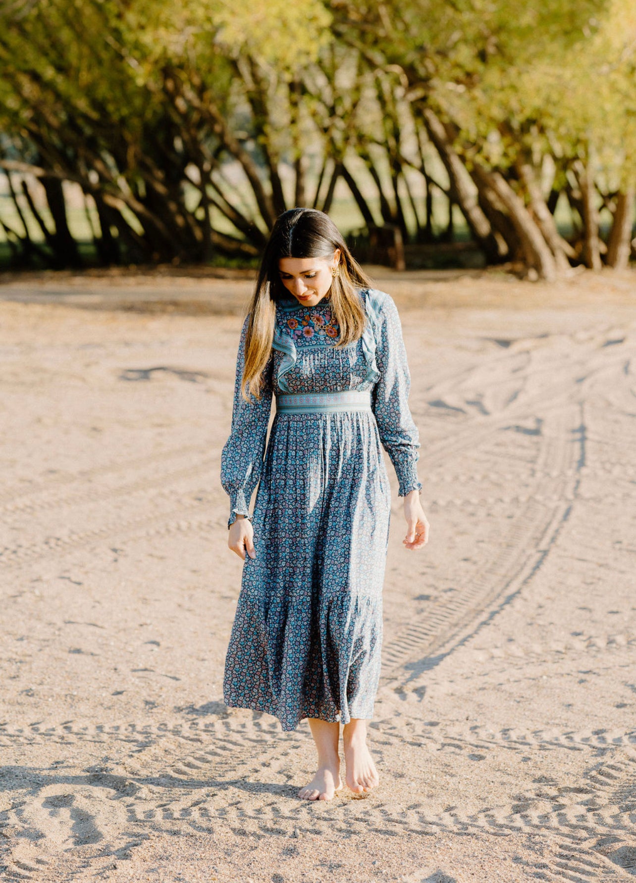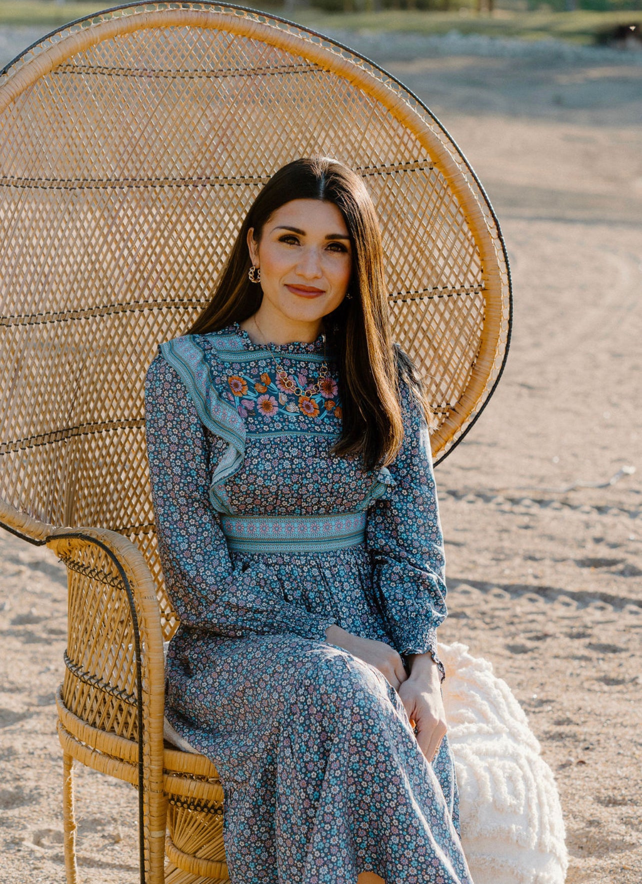 Boho style floral print dress featuring ruffle detail around the shoulder and smocked waist.