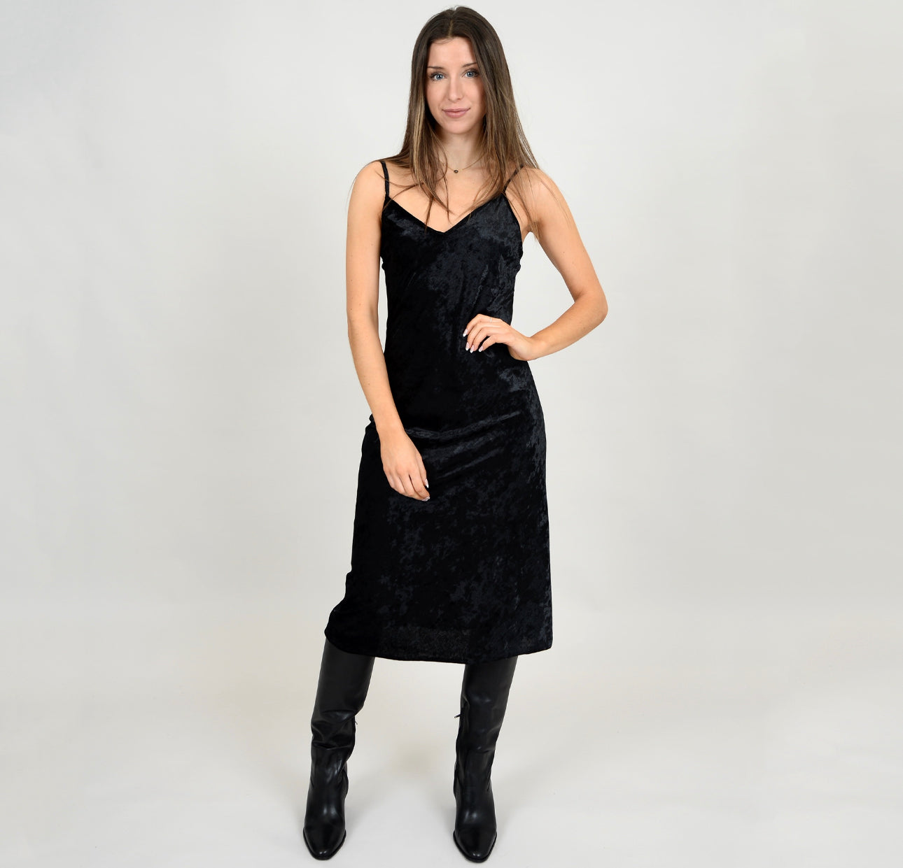 A classic midi slip dress in classic black velvet, easy on its own or perfect as a layering piece for transitional dressing. Layer with a chunky knit or an oversized band tee for a chic look. Adjustable spegetti strap, flattering v neckline and a crushed velvet material.