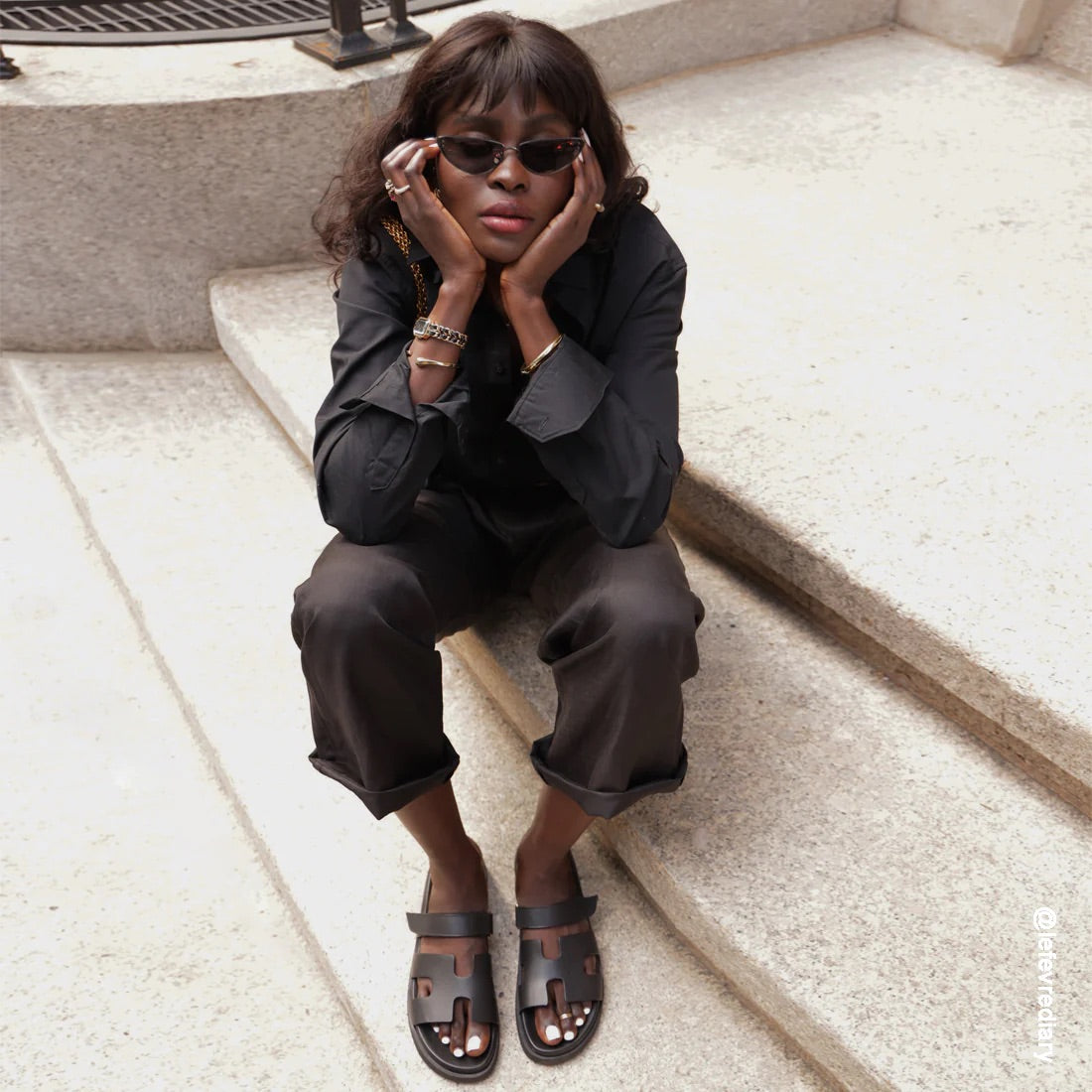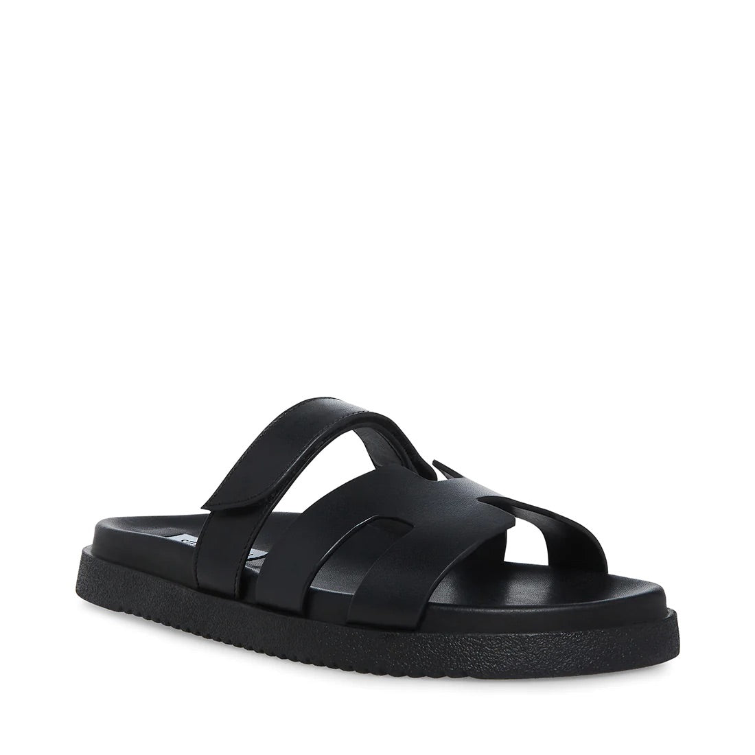 The leather MAYVEN slides feature comfy construction details like a molded footbed, a treaded flatform sole, and an adjustable top strap, plus a front strap with a geometric cutout design.