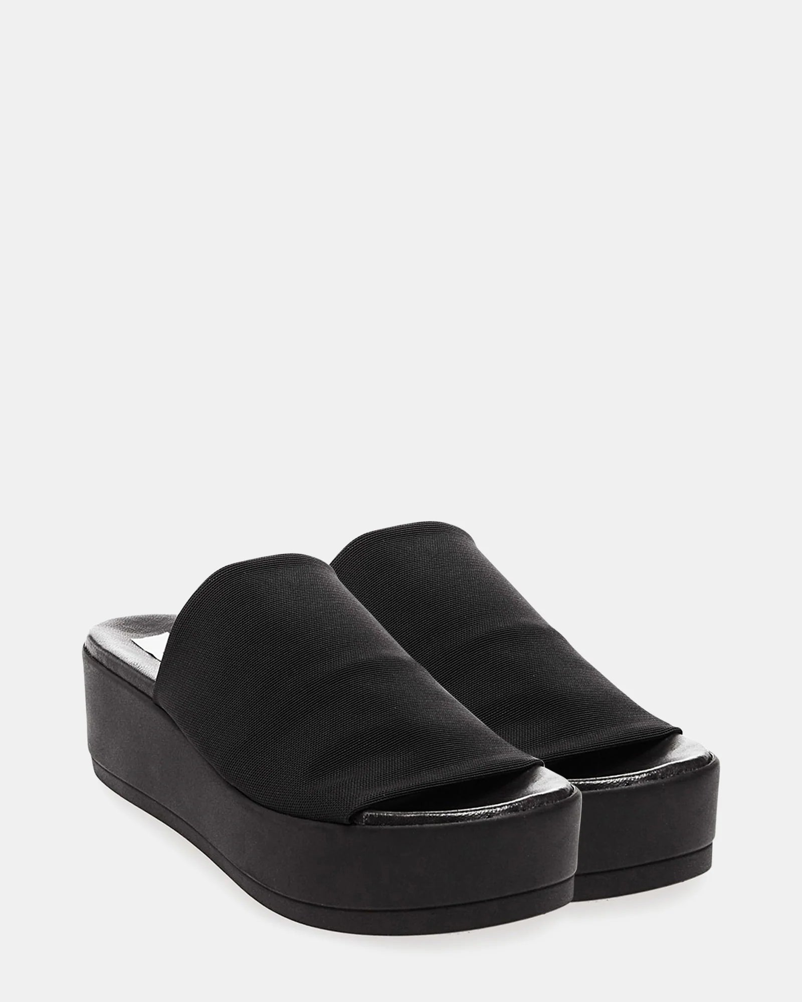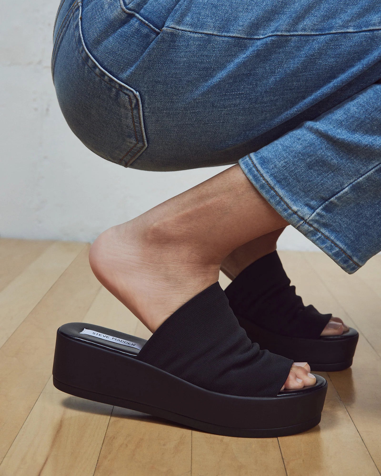Relive your best '90s looks with SLINKY! This throwback favorite slide, featuring a flatform sole and stretchy upper, is back and has never looked better. It's a must-have shoe for longtime SM girls!