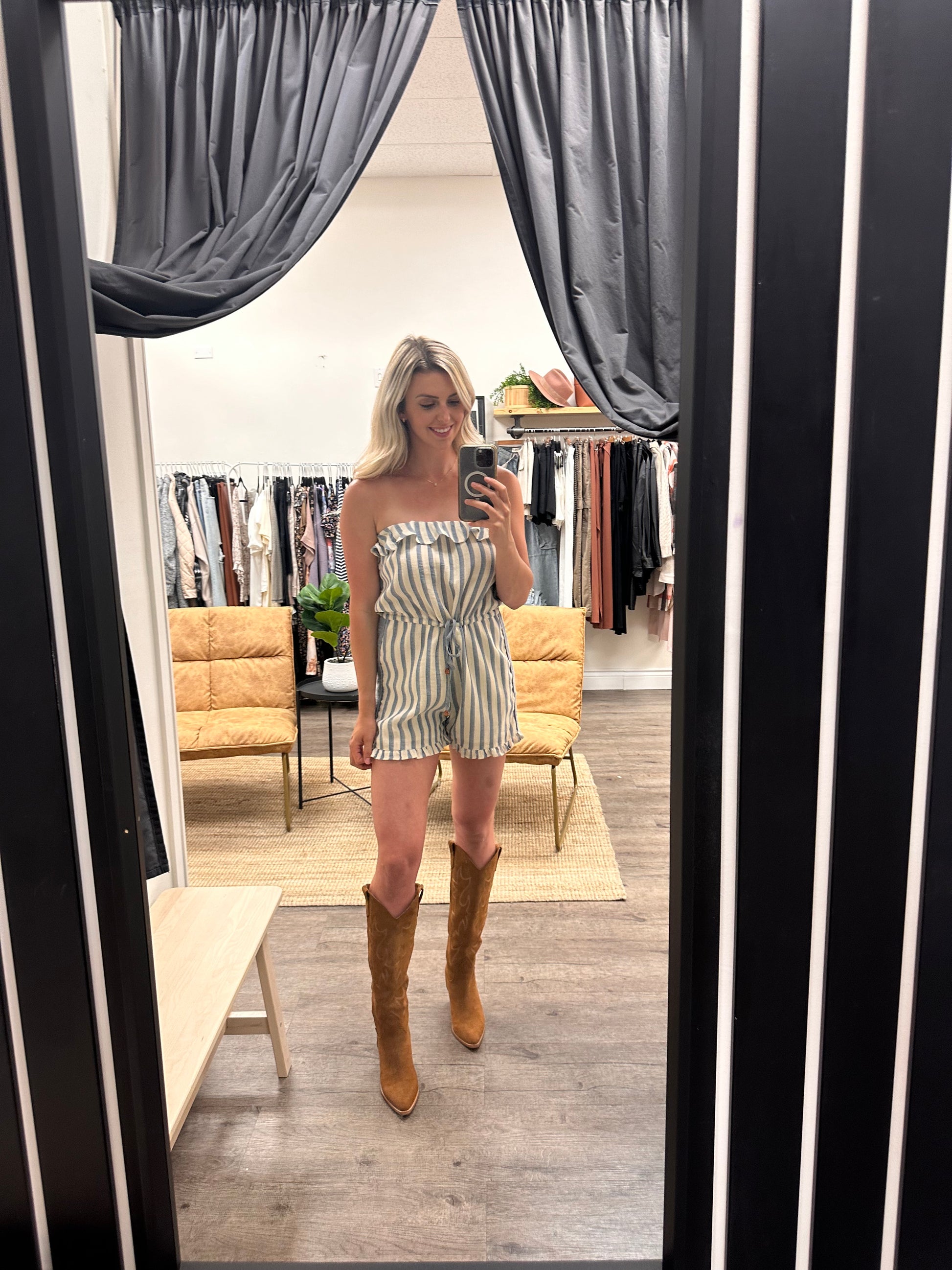 Gorgeous striped ruffle tube romper features a drawstring waist, and is lined. Perfect piece for summer and transitioning into fall when paired with a denim jacket.